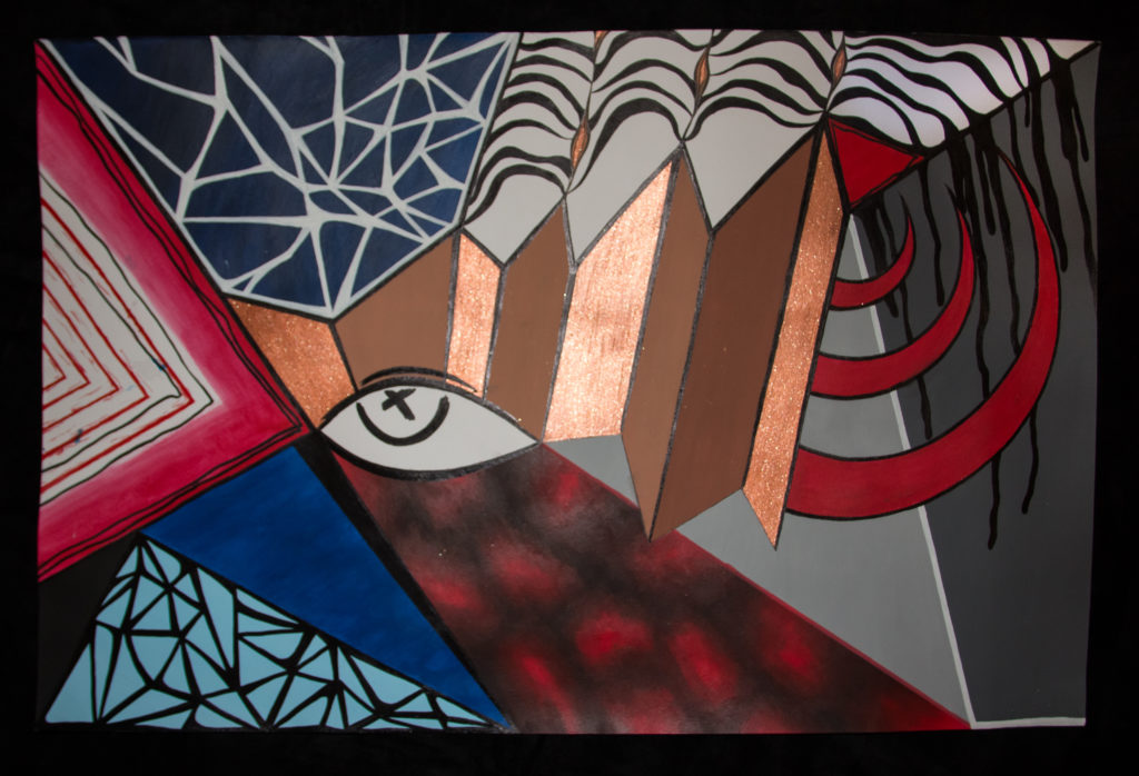 C’est une peinture faite à l’acrylique disposée en couches superposées. Elle représente une vision du monde actuel, c’est à dire une société injuste et cruelle envers l’imposante majorité de l’humanité tandis qu’un petit nombre jouit de ses privilèges. C’est le décalage entre ces situations que j’ai voulu illustrer ici. L’œil sert à rappeler qu’il existe une entité qui contrôle ce système.