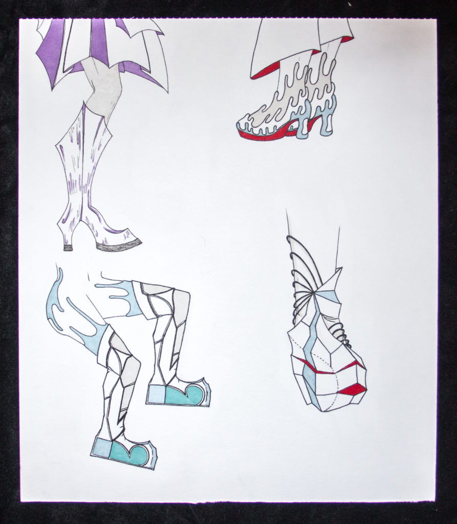 Dessin aux stylos et feutres de chaussures mêlant un esprit western, des motifs futuristes et de coulures chics. J’ai voulu mélanger plusieurs modes en ajoutant une touche gluante tout en restant dans l’esthétisme.