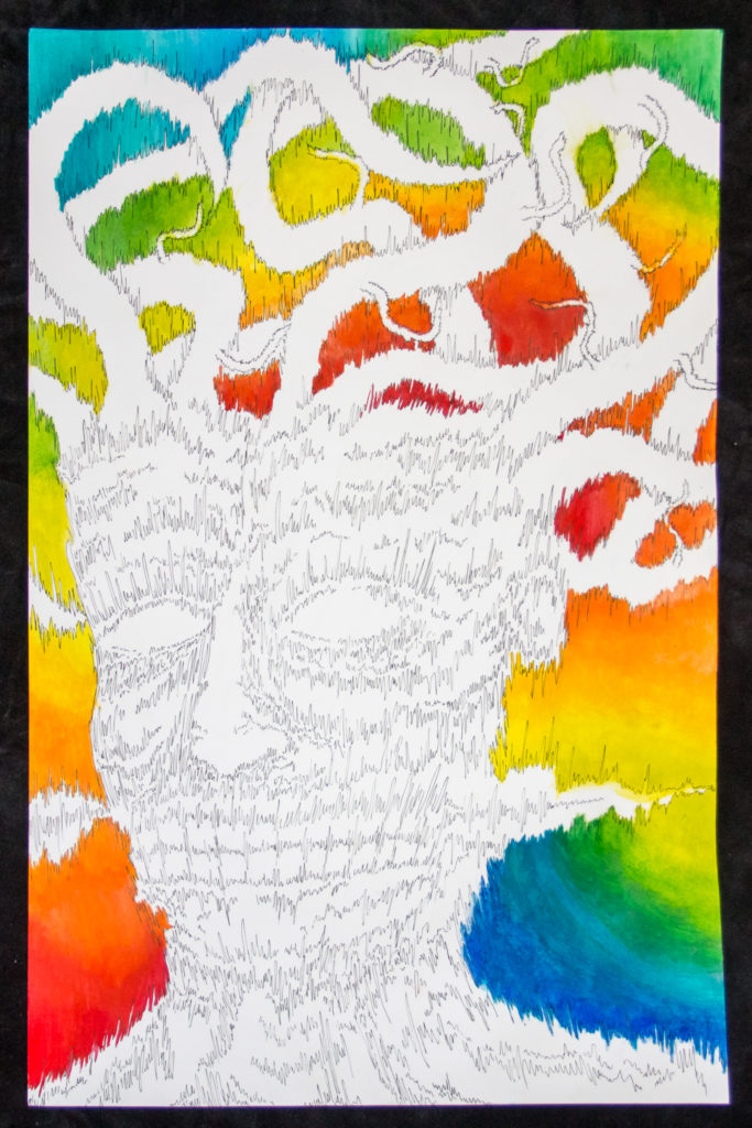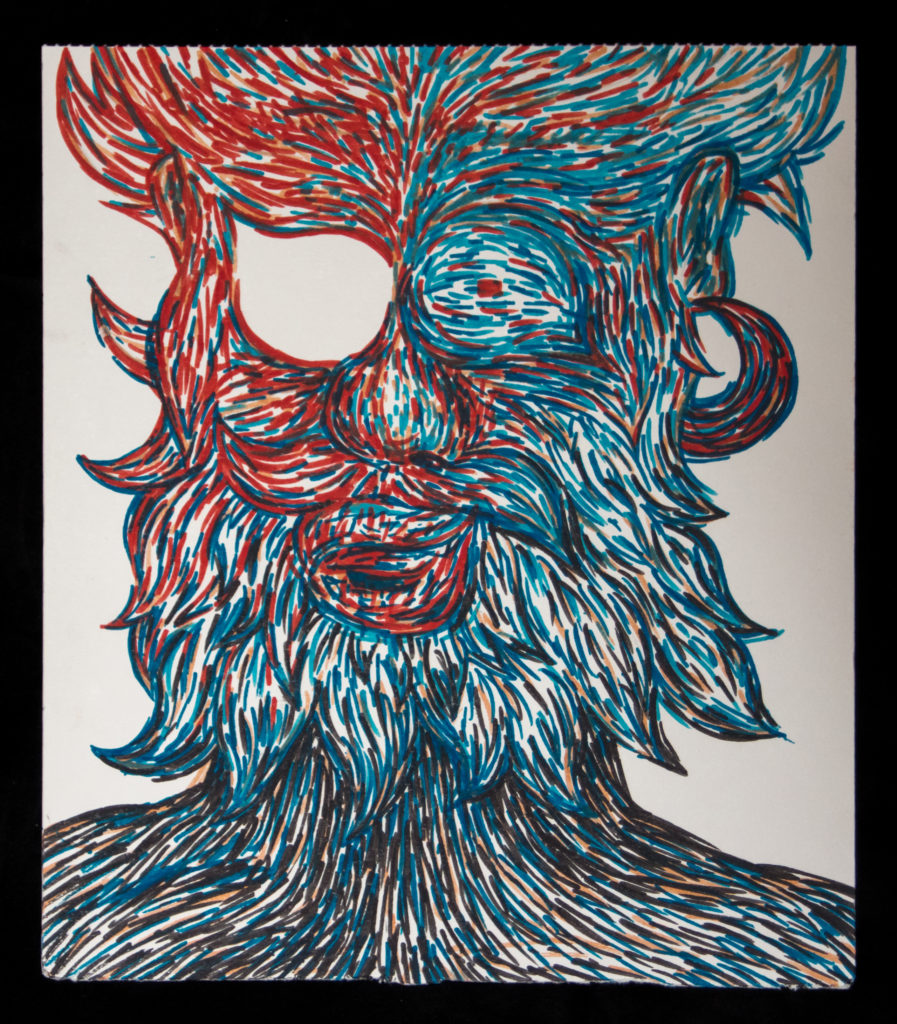 Dessin au feutre mêlant une volonté de faire se fondre ensemble couleurs froides et chaudes et un souhait de créer une structure en mouvement par la fluidité des traits. J’ai voulu personnifier l’hiver en représentant sur cet homme un aspect figé, glacial qui contraste avec le rouge et donne à son regard un air sournois.