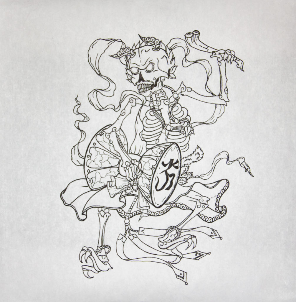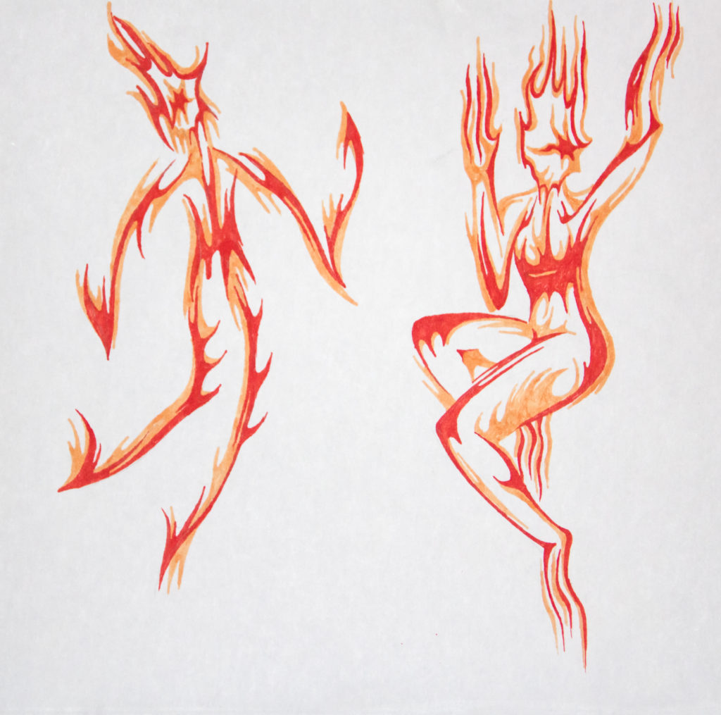 Les dessins au stylo noir rappellent le tatouage inspiré de la culture chinoise et celui en couleur peut évoquer des feu-follets faisant partie de la culture celte. Ce style de dessin est assez récurrent dans mon travail.