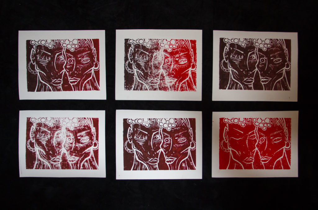 Gravure sur lino exécuté avec différents dosages d’encres rouge et noire. On peut distinguer une altérité dans l’apparence féminin masculin ainsi que dans les courbes pleines et les traits saillants. Il y a également un coté symétrique dans la concordance de leurs traits de visages qui évoque un caractère fraternel, mais aussi dans le fait qu’ils sont tous deux tournés vers le milieu de l’image.