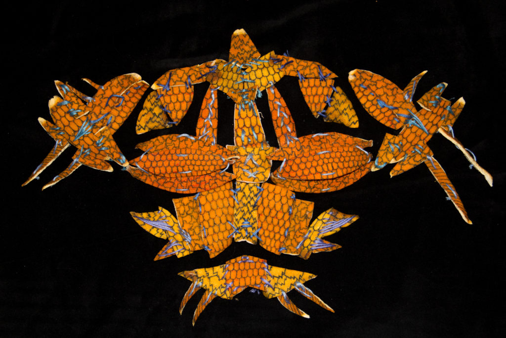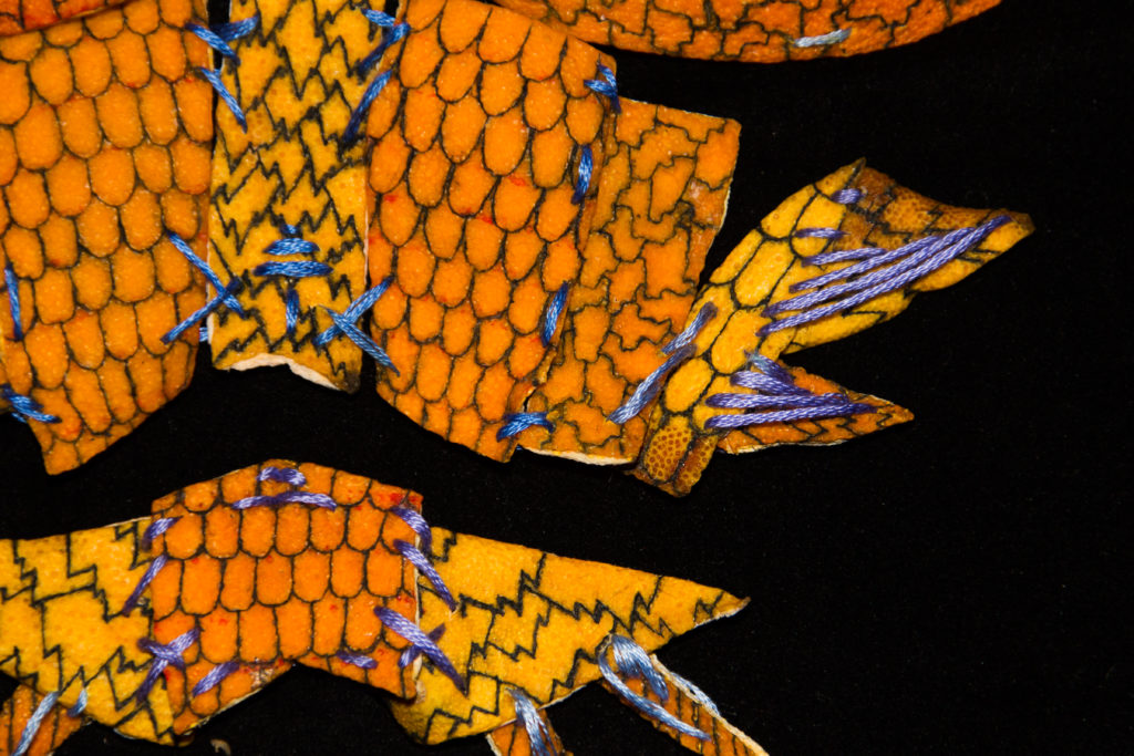 Les oranges et pamplemousses ont été découpés en morceaux de manière à former les pièces d’un corset pour femme. Les différentes pièces ont ensuite été tatouées avec une machine pour donner un aspect de peau de reptile et fixés ensemble à l’aide de fil de broderie afin de rappeler le caractère de vêtement. Mon but était de créer un vêtement en utilisant des matériaux insolites qui évoquent les arts premiers.